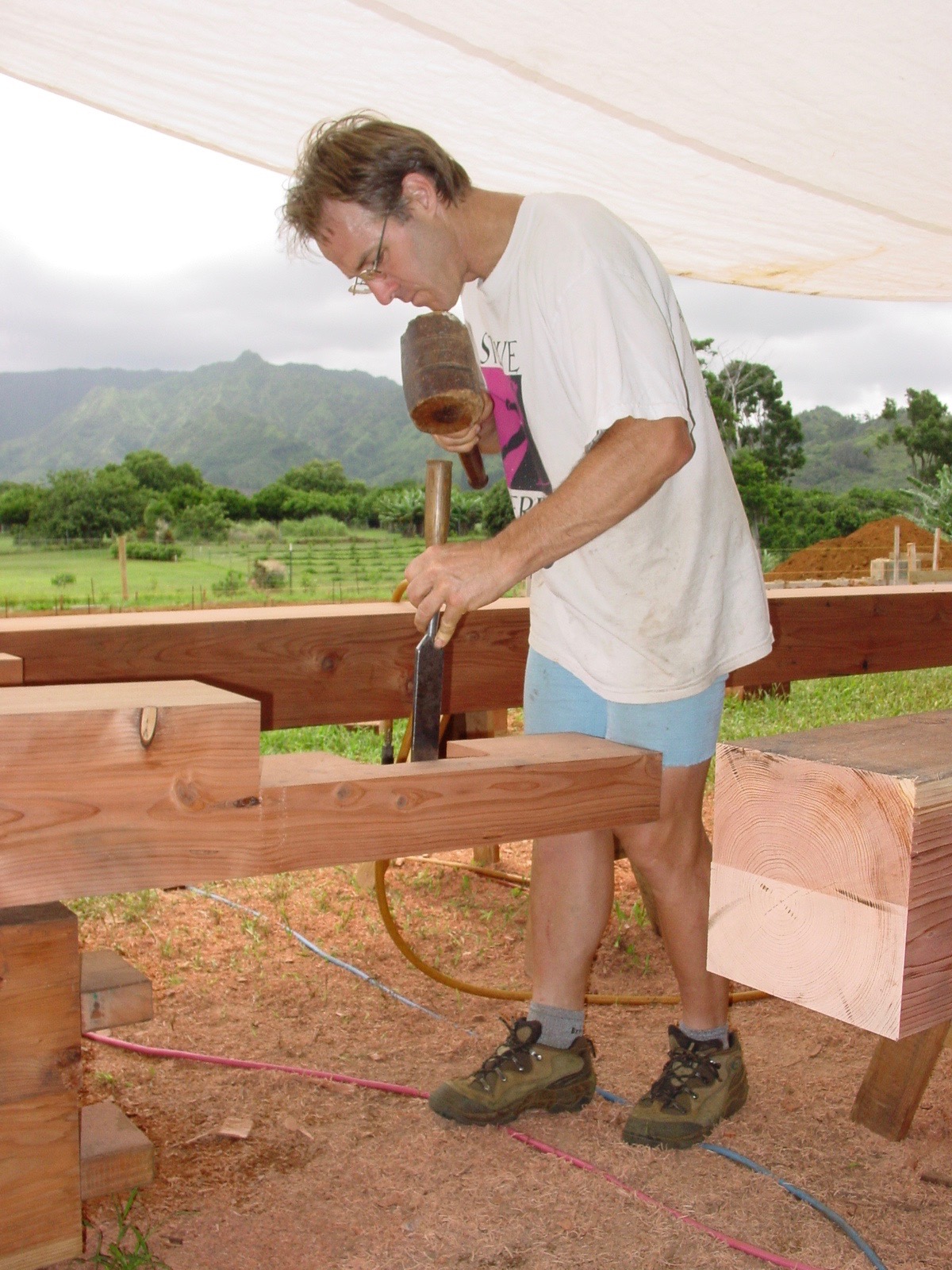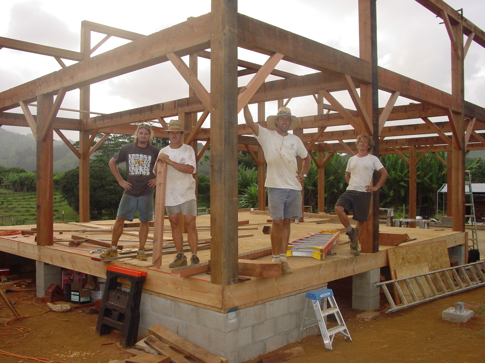 Over the course of two months the timbers were slowly sculpted by my life long friend and master timber framer, Scott Dorwart of Stowe, Vermont. Despite the prospect of having to leave his wife and two children for nearly three months (something he rarely does) Scott arrived in Kauai to begin work on this exciting project. The challenge that faced him would be the turning of raw wood timbers into the frame work of a barn that would serve many purposes. Having spent a couple of summers in Vermont many years back, laboring with Scott to build his own house, it was during those years that I gained an appreciation for this style of old-world architecture. Mortised and tenoned, drilled and framed with wood dowels, the barn at Blair Estate was chiseled into a six bent system and created entirely on the ground.